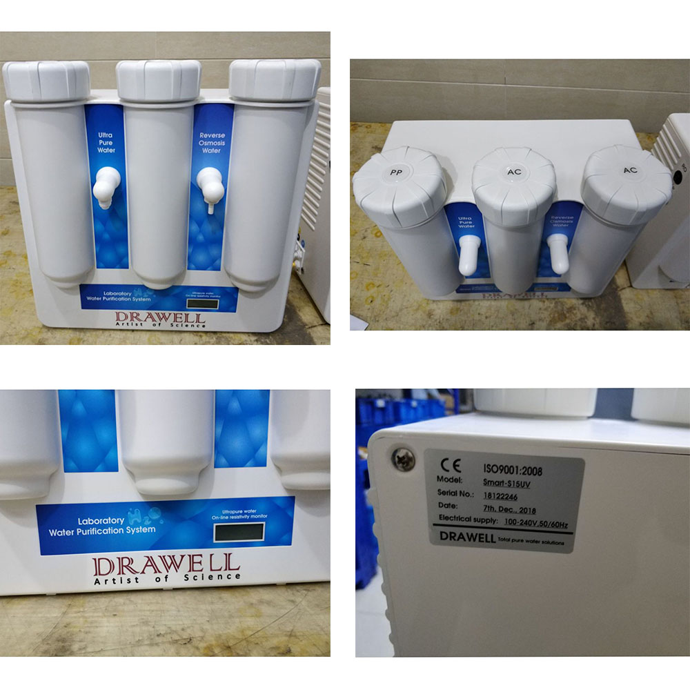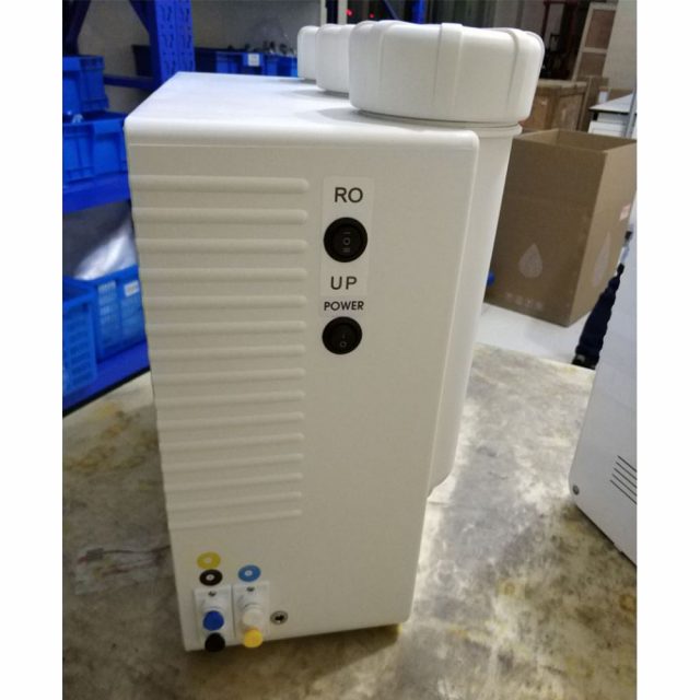 With tap water inlet, its output ranges from 15 to 30 liters/hour. It can produce single stage RO water. The single stage RO water’s ion rejection rate is more than 96% (new RO membrane), organic rejection rate>99% (when mw>200 Dalton), particles and bacteria rejection rate>99%. It is suitable for glassware washing, feed of ultrapure water system, autoclave sterilizer, constant temperature and humidity chamber, salt spray test chamber, dampening machine and etc.